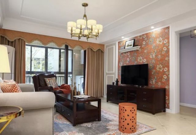 走过玄关走廊就到了客厅空间,客厅的电视背景墙带着一些乡村、复古的感觉,独特的花纹壁纸和石膏线结合,在灯光的衬托下有种特别的美感。