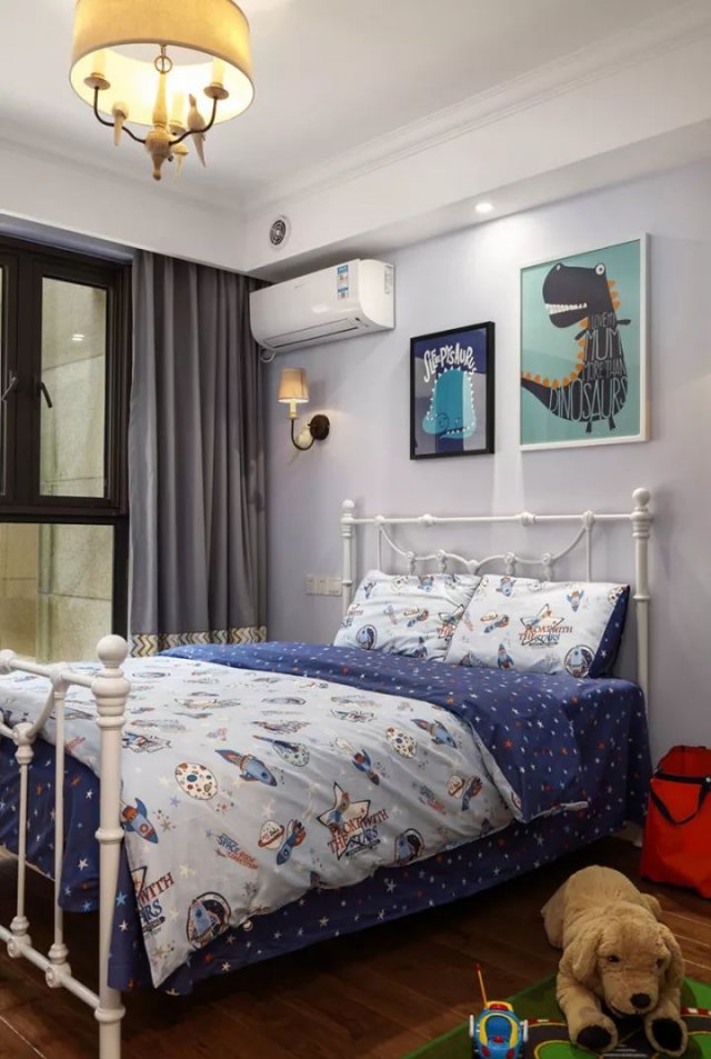 儿童房的布置会更为可爱一些,在软装上加入了不少的卡通元素,铁艺的床也显得更为简洁文艺,整个儿童房简单而又好看。