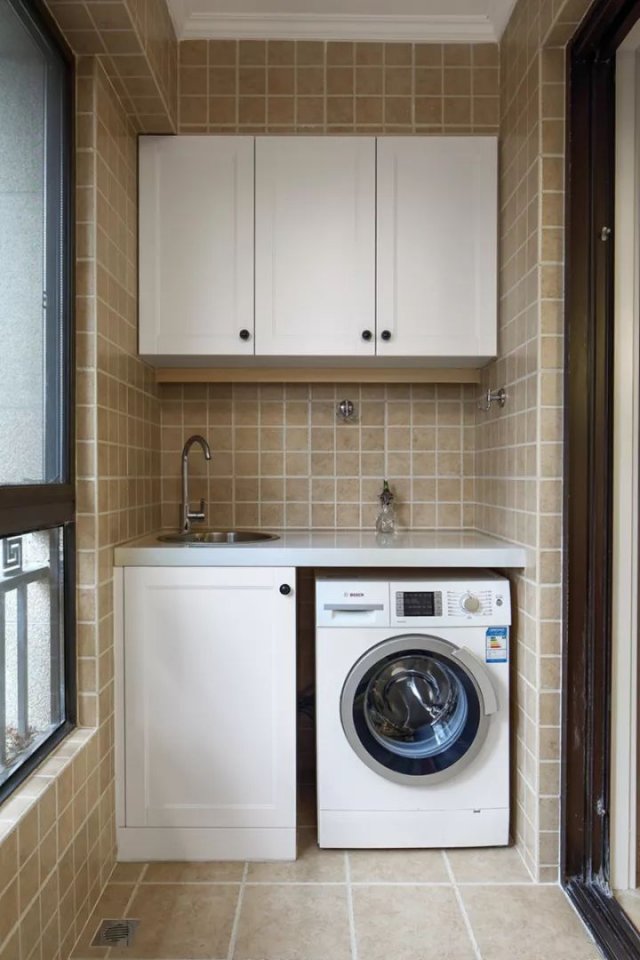 小阳台的面积不大,还承担着洗衣晾晒的需求,设计师把洗衣机和洗手台结合起来,上方做上吊柜,天花板的四周还加上石膏线装饰边框,既实用又美观。