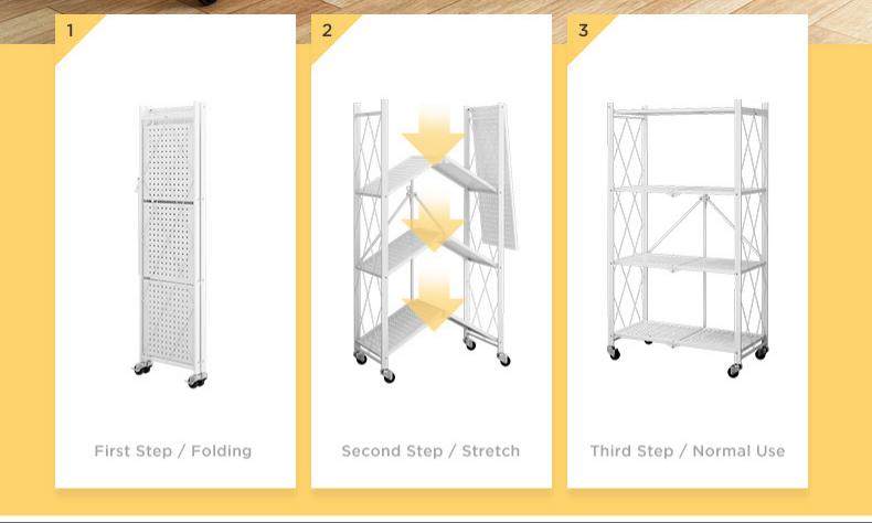 随着烹饪方式的丰富,厨房的电器设备逐渐增多,如微波炉、烤箱、料理机等,想把这些电器通通收纳起来,四层可折叠置物架可助你一臂之力!四层大容量设计,非常适合收纳,也节省了厨房空间。