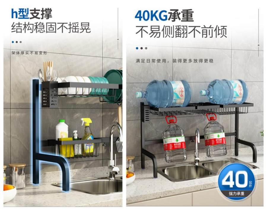 这款水槽置物架具有强大的承重能力,40公斤左右的物品都能收纳,而且还非常的稳固,不会出现前倾侧翻的情况。h型支撑设计,结构十分稳固,不会轻易变形。